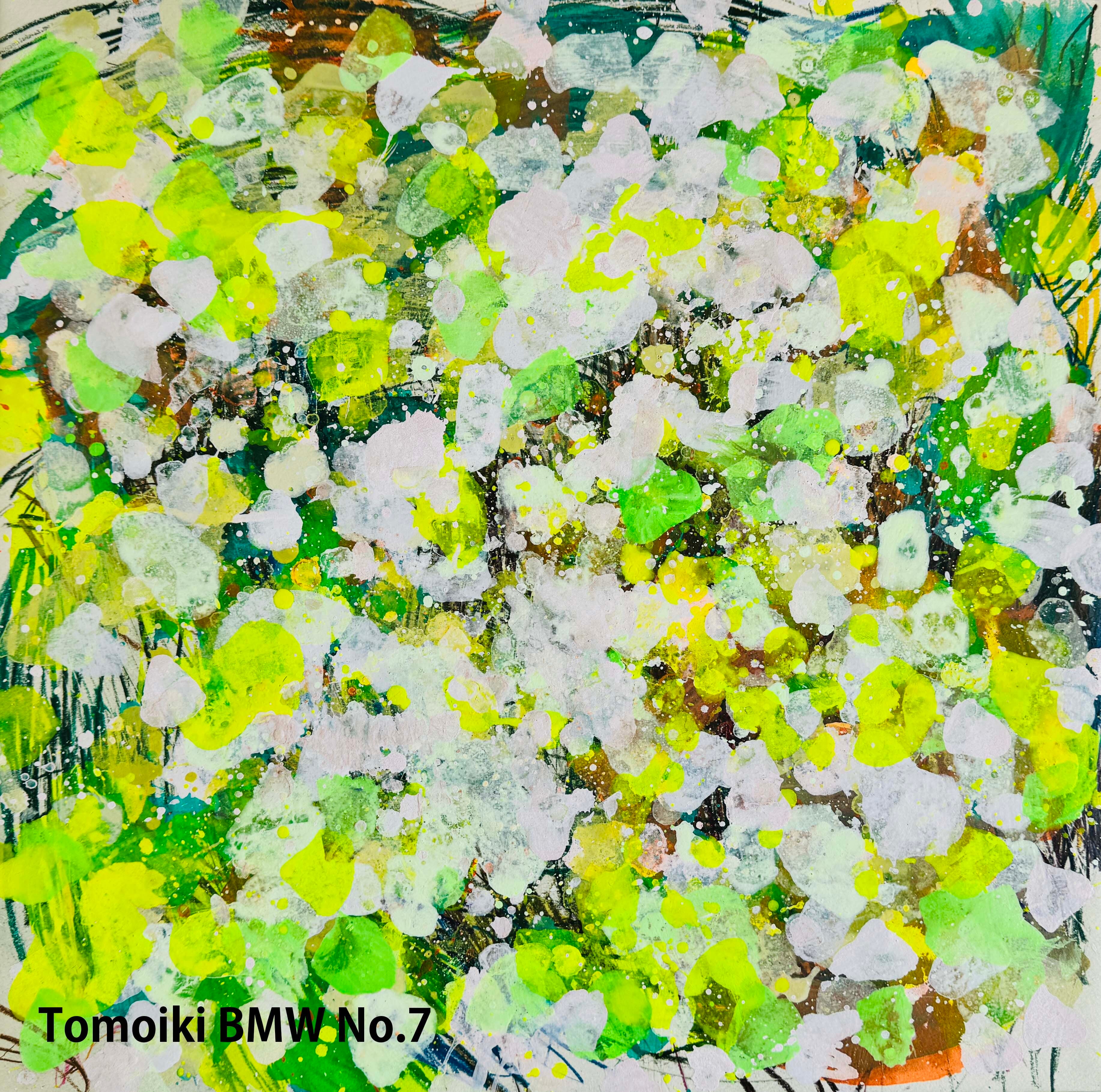 水彩色鉛筆の細かいタッチと絵具の大胆なタッチがまるで華の様に画面に広がる抽象表現です。近作は白い絵具と色鉛筆のタッチに変化が現れ,さらに独特の画面構成が生まれています。エイブルアート登録作家。フェリシモの洋服など商品化多数。